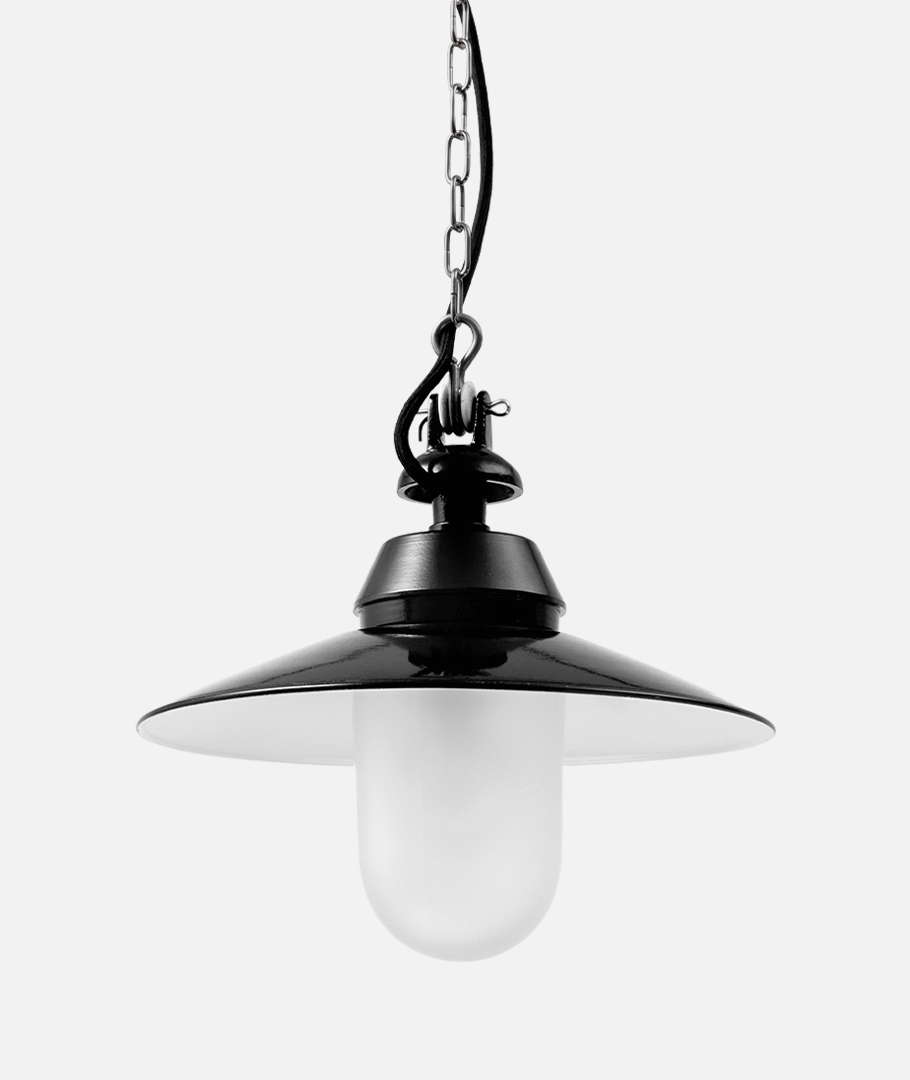 Eine robuste Leuchte mit flachem Reflektor und Schraubglas in Zylinderform. Aus traditionell gefertigten Guss- und Drückteilen sowie einzelnen Porzellanelementen. Dort, wo noch Wert auf stimmige Details gelegt wird, ist sie nicht wegzudenken.